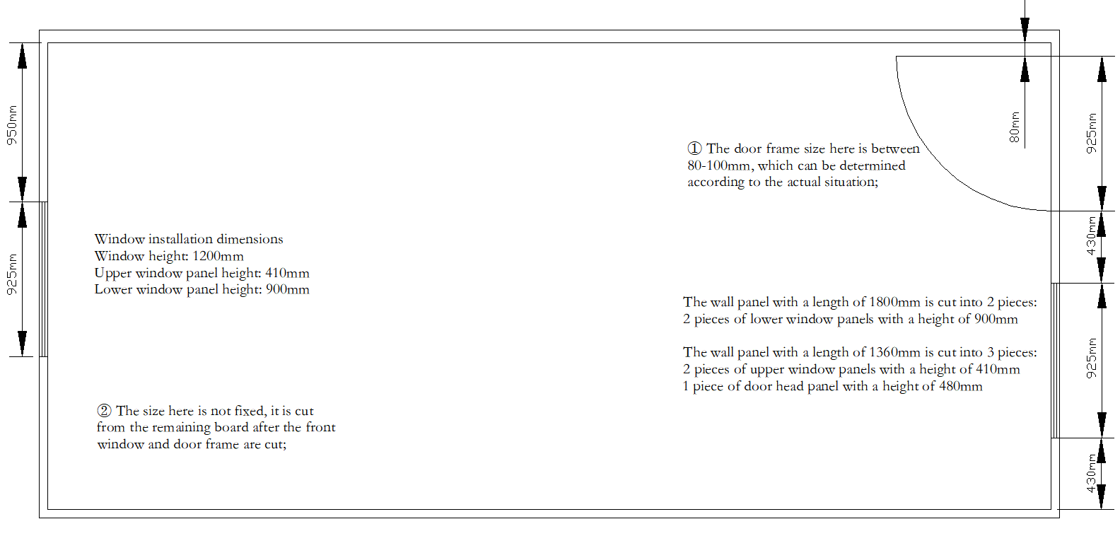 (b)。将2510mm的墙板切成950mm宽度为80mm和870mm(这里的切割是灵活的,可以根据现场安装条件进行切割); 80mm墙板用作前窗的门框(门框的大小为80-100mm);其余的870mm用作后窗的墙板(根据现场安装条件切割)。