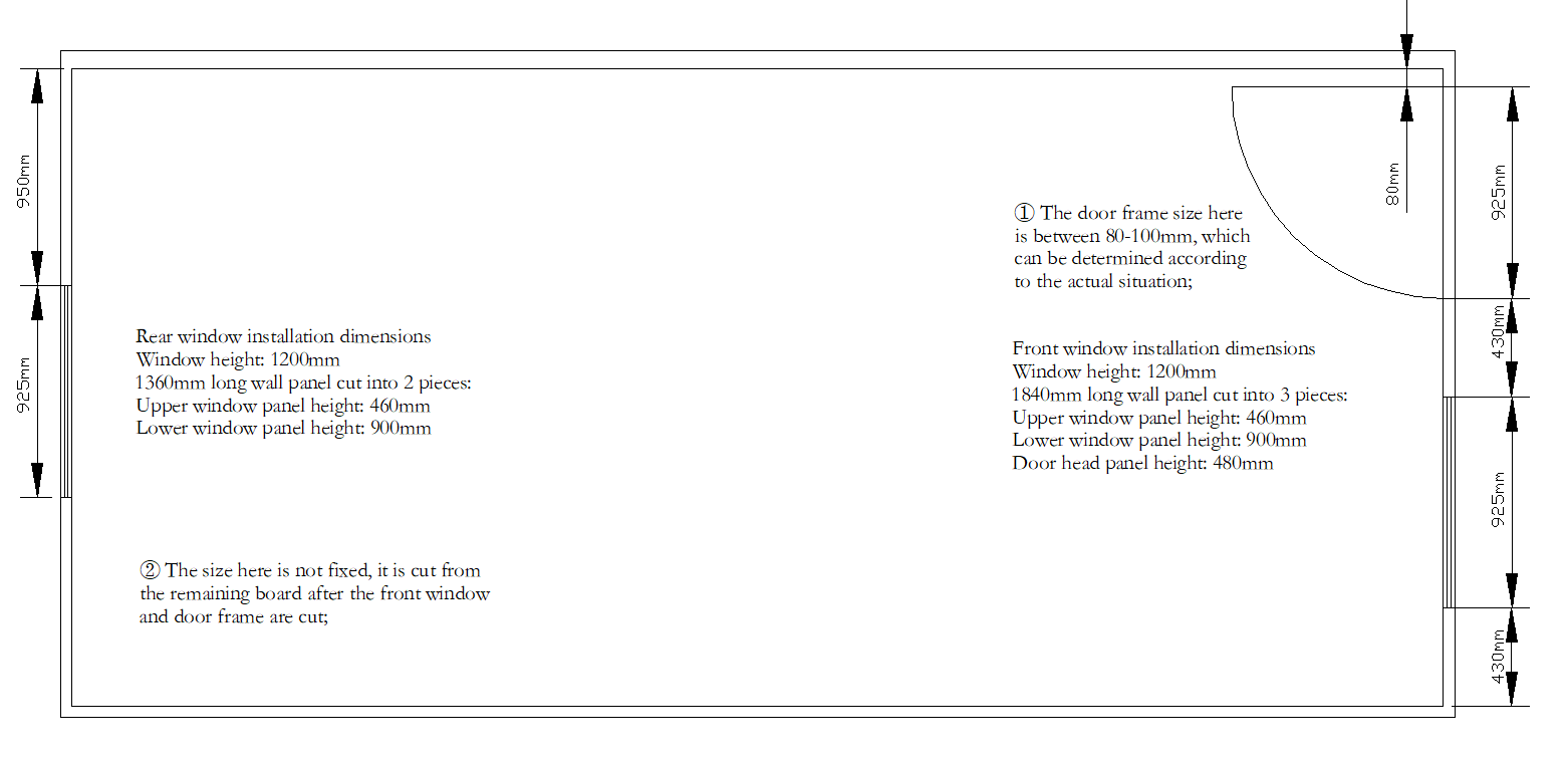 (b)。将2510毫米长的壁板和950mm宽的墙板切成80mm和870mm(这里的切割是灵活的,可以根据现场安装条件进行切割); 80mm墙板用作前窗的门框(门框的大小为80-100mm);其余的870mm用作后窗的墙板(根据现场安装条件切割)。